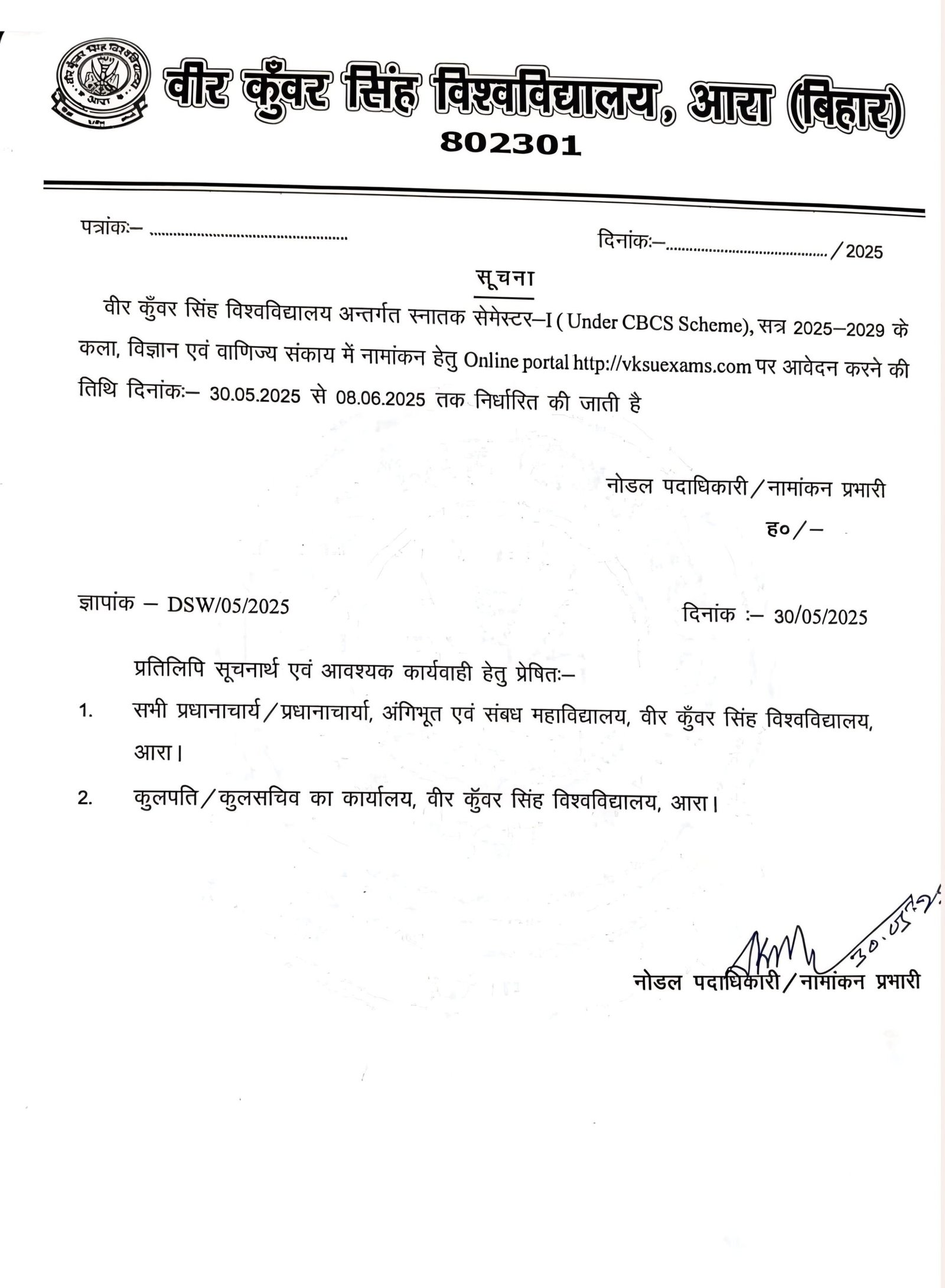 VKSU UG Semester-1 Admission 2025